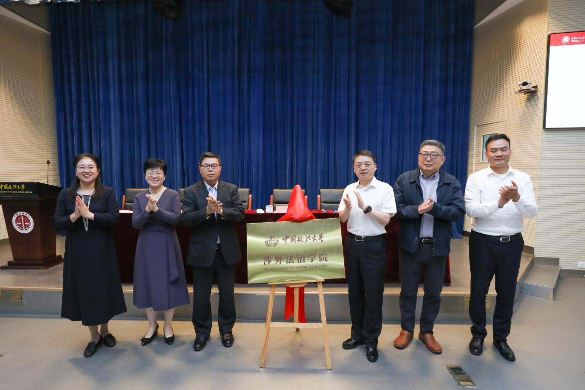 随后,贾珅秘书长与中国政法大学校长马怀德,外交部边界与海洋事务司原司长、原驻挪威、斯里兰卡大使易先良,中国国际法学会常务副会长李鸣,北京仲裁委员会/北京国际仲裁院委员兼秘书长姜丽丽,中国政法大学副校长刘艳红共同为中国政法大学涉外法治学院揭牌。