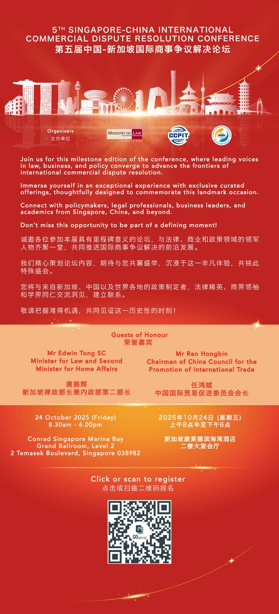 第五届中国-新加坡国际商事争议解决论坛将于2025年10月24日在新加坡举行!本届论坛由国际商事争端预防与解决组织、中国国际贸易促进委员会以及新加坡律政部共同主办。诚邀各位同仁共襄盛举,欢迎扫描海报下方二维码报名!
