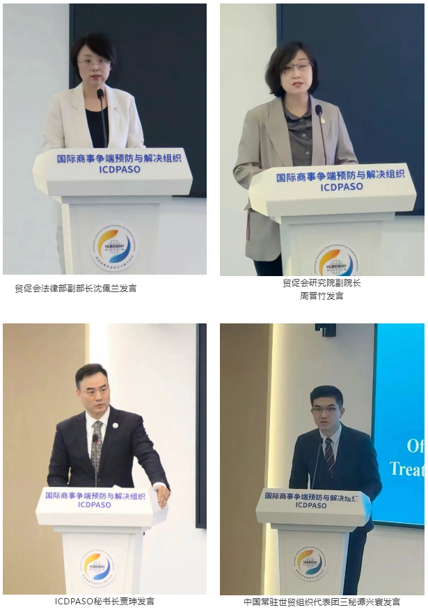沈佩兰副部长在系统介绍了贸促会法律服务体系的建设历程与业务布局之后,重点指出贸促系统法律服务已经形成覆盖商事调解、仲裁、知识产权、合规建设等多领域的全链条服务体系,并特别提到作为由贸促会倡导成立的国际组织,ICDPASO在推动国际商事争端预防与化解方面发挥了积极作用。