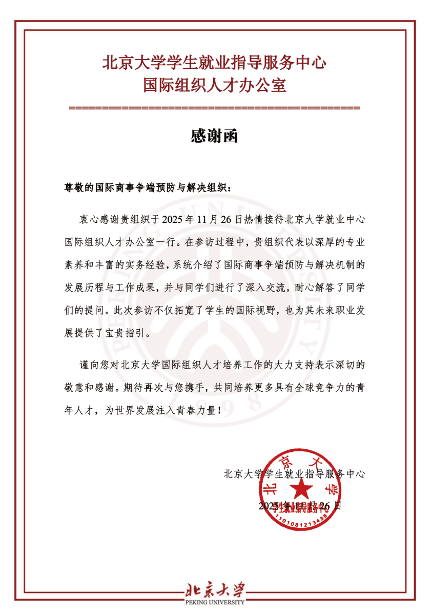 2025年11月26日,北京大学全球胜任力参访团走进国际商事争端预防与解决组织(ICDPASO)。