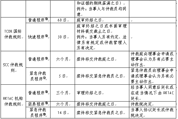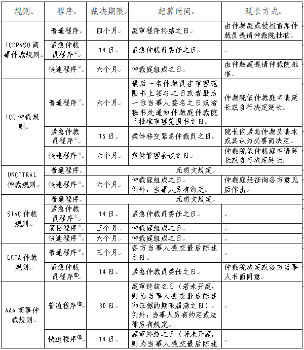 从比较法的视角看,不同机构的仲裁规则对于不同程序的裁决期限、起算时间、期限延长方式的规定各不相同。以下选取《ICC仲裁规则》《UNCITRAL仲裁规则》《SIAC仲裁规则》《LCIA仲裁规则》《AAA商事仲裁规则》《ICDR国际仲裁规则》《SCC仲裁规则》以及《HKIAC机构仲裁规则》,与本规则中关于不同程序的相关规定进行对比: